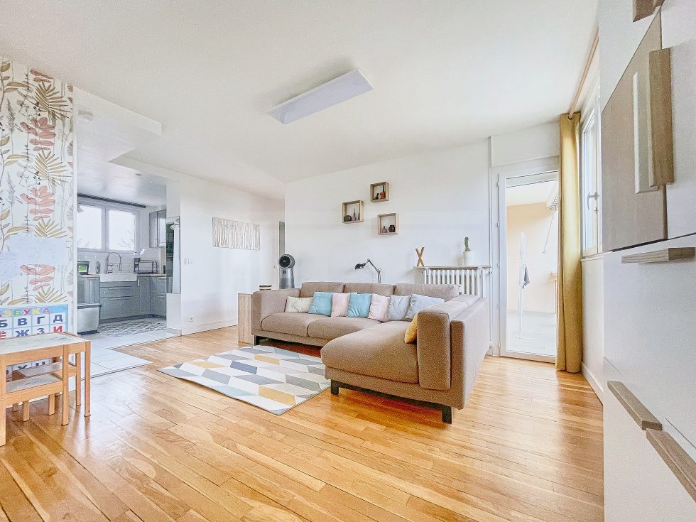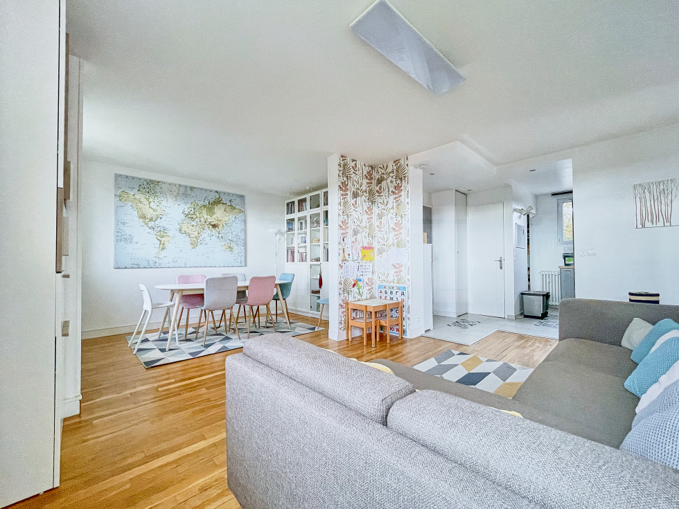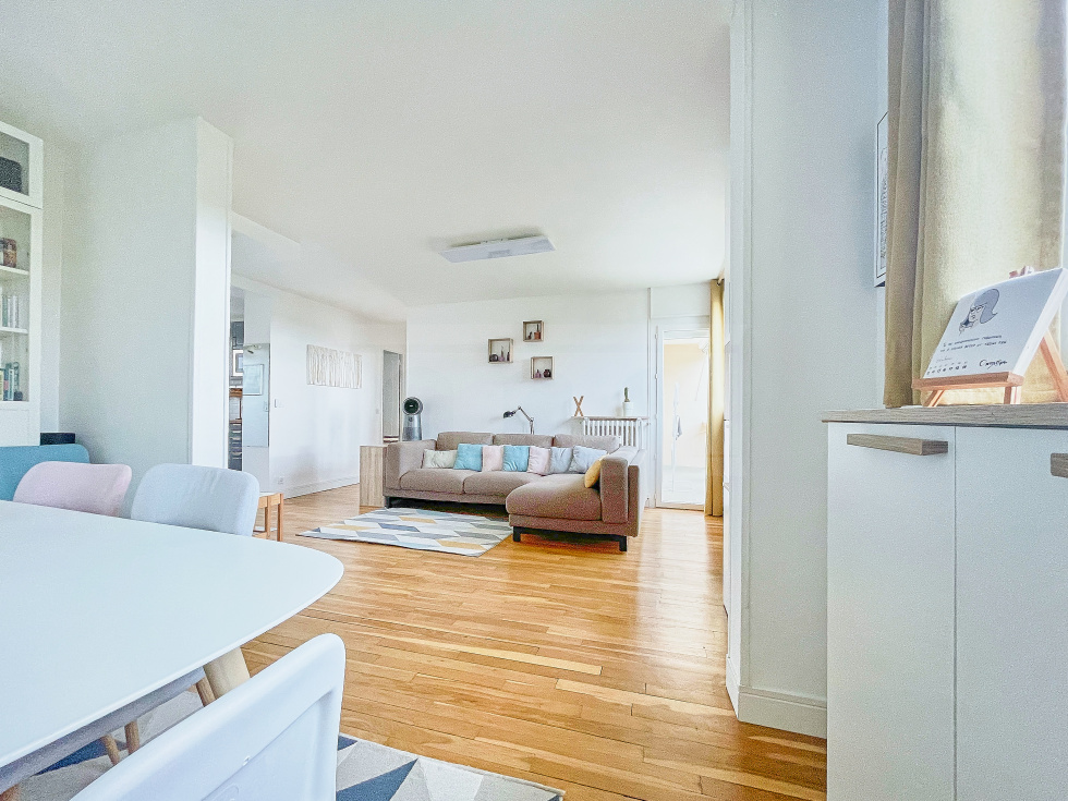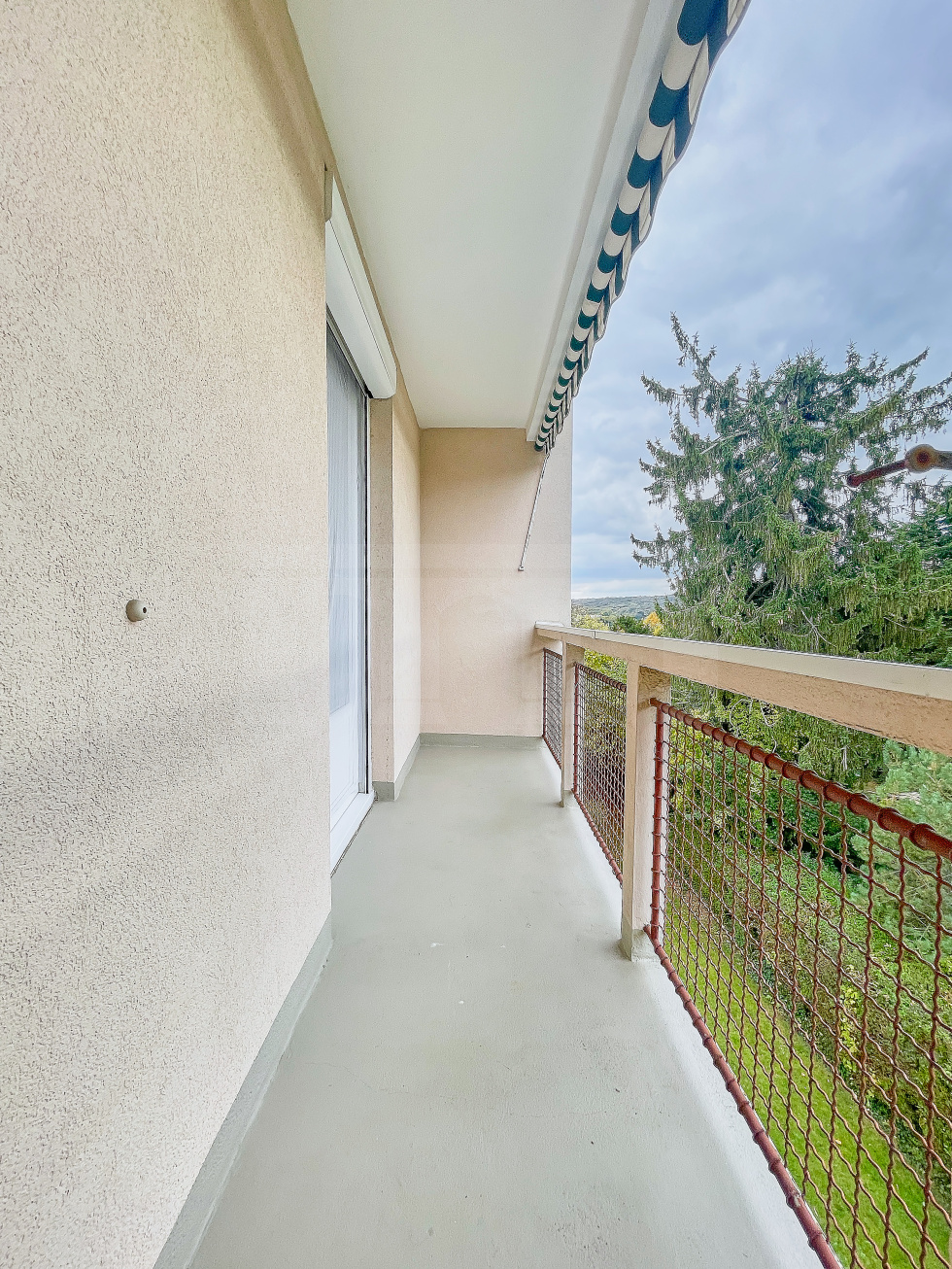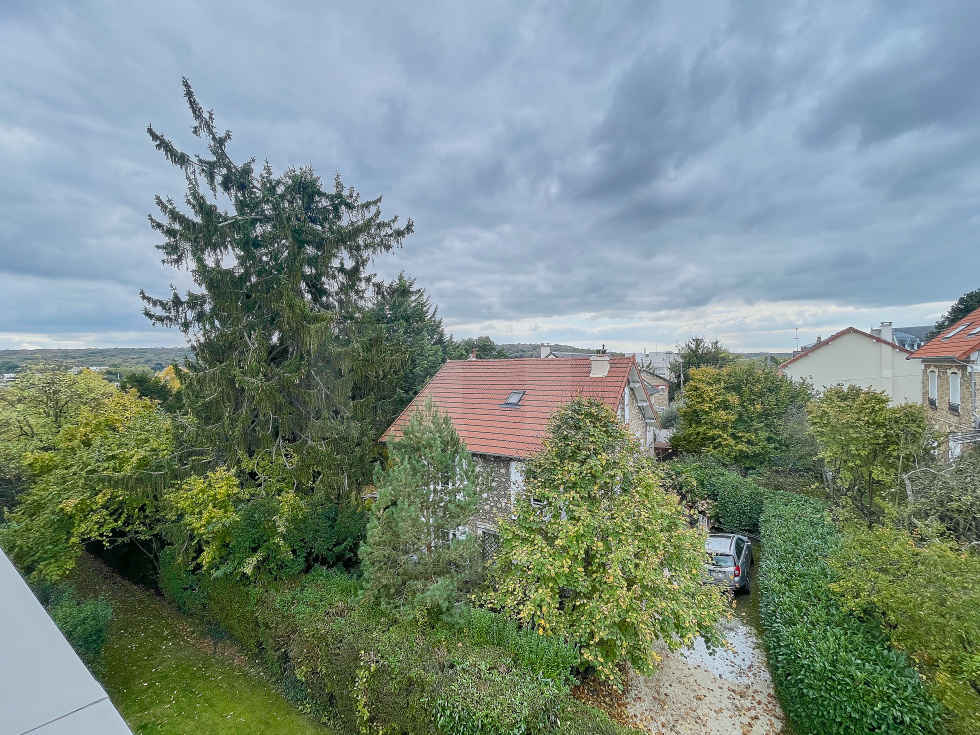 Dans une copropriété située sur les hauteurs de la rive droite de Viroflay, en dernier étage, appartement de 4 pièces principales traversant, avec un balcon exposé ouest sans vis-à-vis et une grande cave.Il comprend : une entrée, WC, cuisine et cellier, séjour avec accès balcon, salle à manger, dégagement, salle de bains et deux chambres (dont une avec accès à l'espace extérieur).Place de parking extérieure. En excellent état général. Lumineux et au calme..A 10 minutes de la gare rive droite, des commerces et des écoles, et 6 min de la forêt.