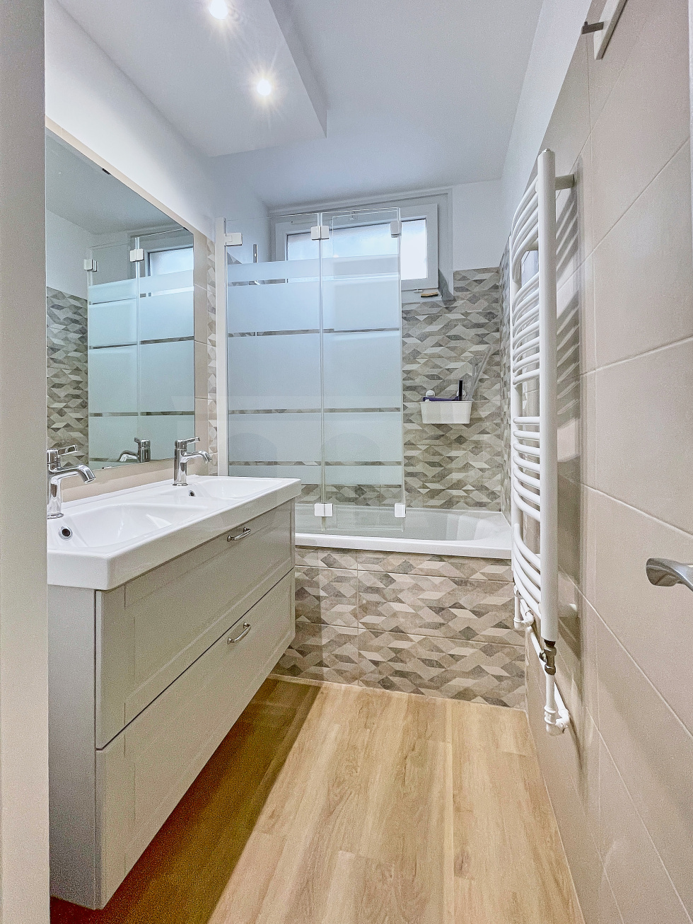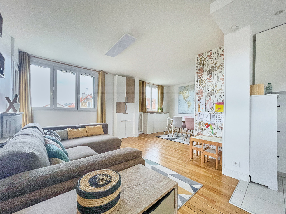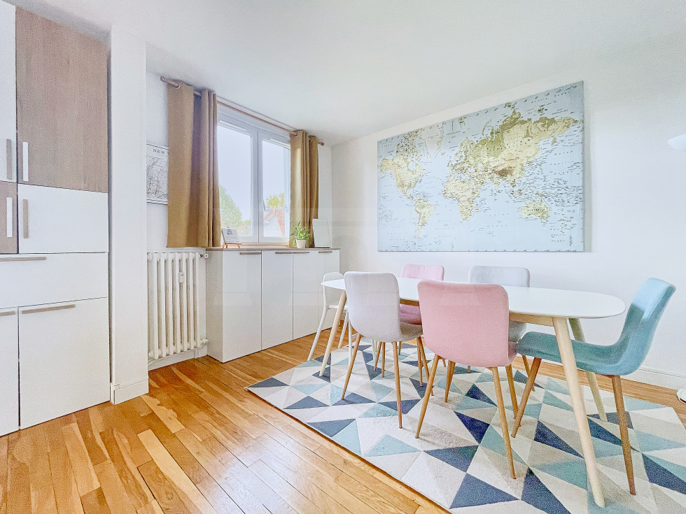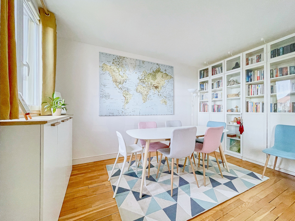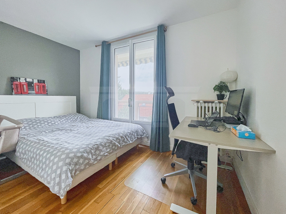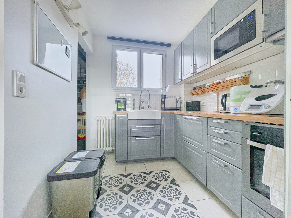 Dans une copropriété située sur les hauteurs de la rive droite de Viroflay, en dernier étage, appartement de 4 pièces principales traversant, avec un balcon exposé ouest sans vis-à-vis et une grande cave.Il comprend : une entrée, WC, cuisine et cellier, séjour avec accès balcon, salle à manger, dégagement, salle de bains et deux chambres (dont une avec accès à l'espace extérieur).Place de parking extérieure. En excellent état général. Lumineux et au calme..A 10 minutes de la gare rive droite, des commerces et des écoles, et 6 min de la forêt.